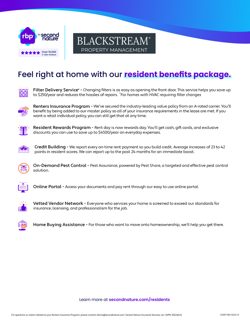 All Blackstream Property Management residents are enrolled in the Resident Benefits Package (RBP) for $54.95/month which includes liability insurance, credit building to help boost the resident’s credit score with timely rent payments, HVAC air filter delivery (for applicable properties), our best-in-class resident rewards program, on-demand pest control, and much more! More details upon application.